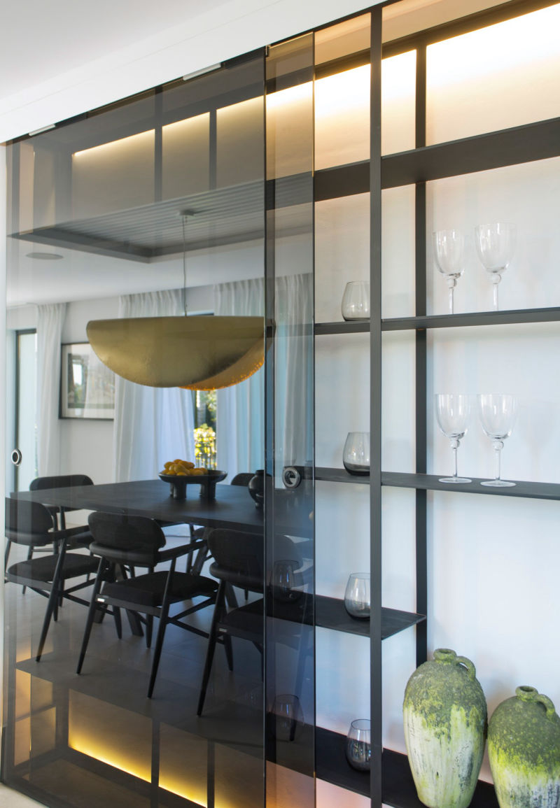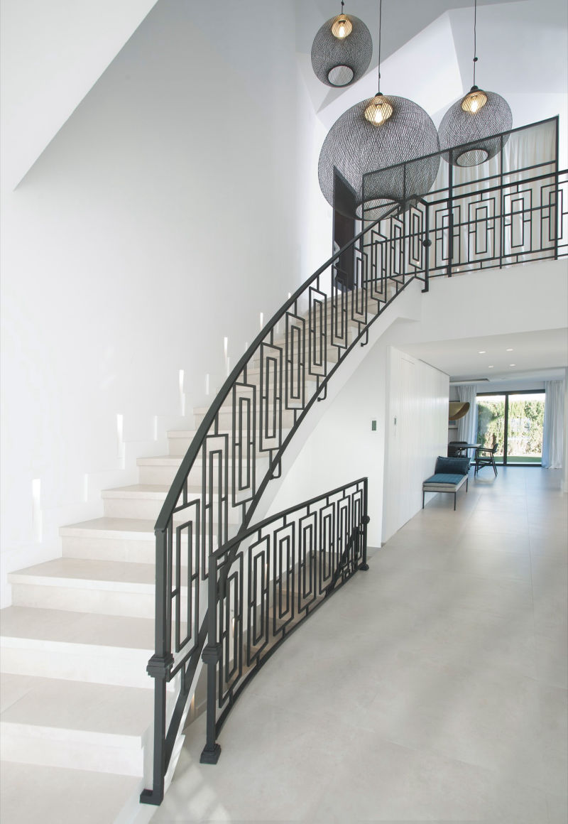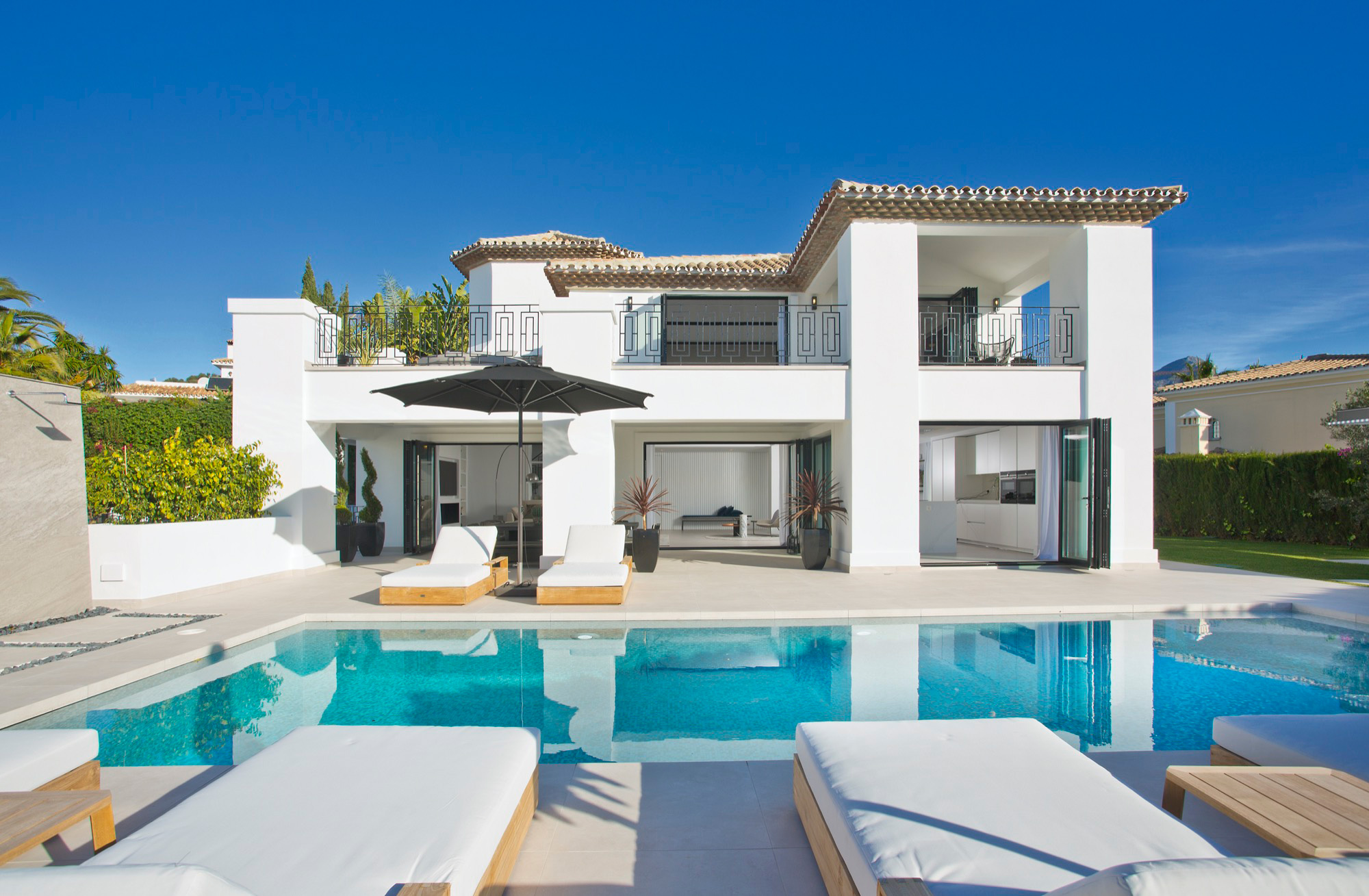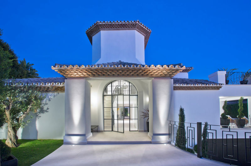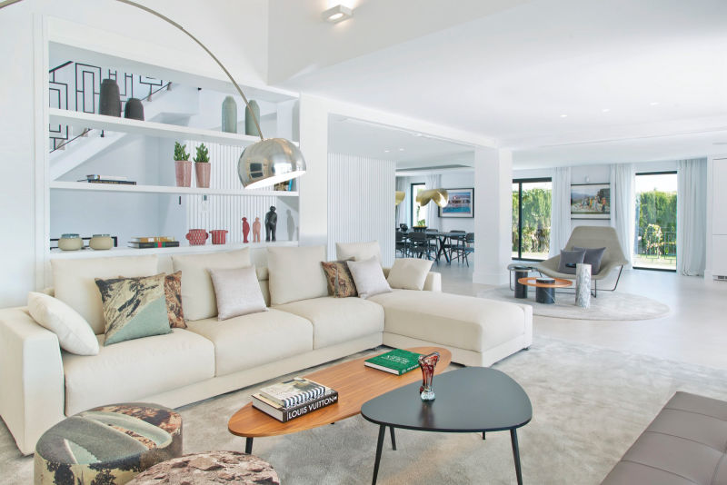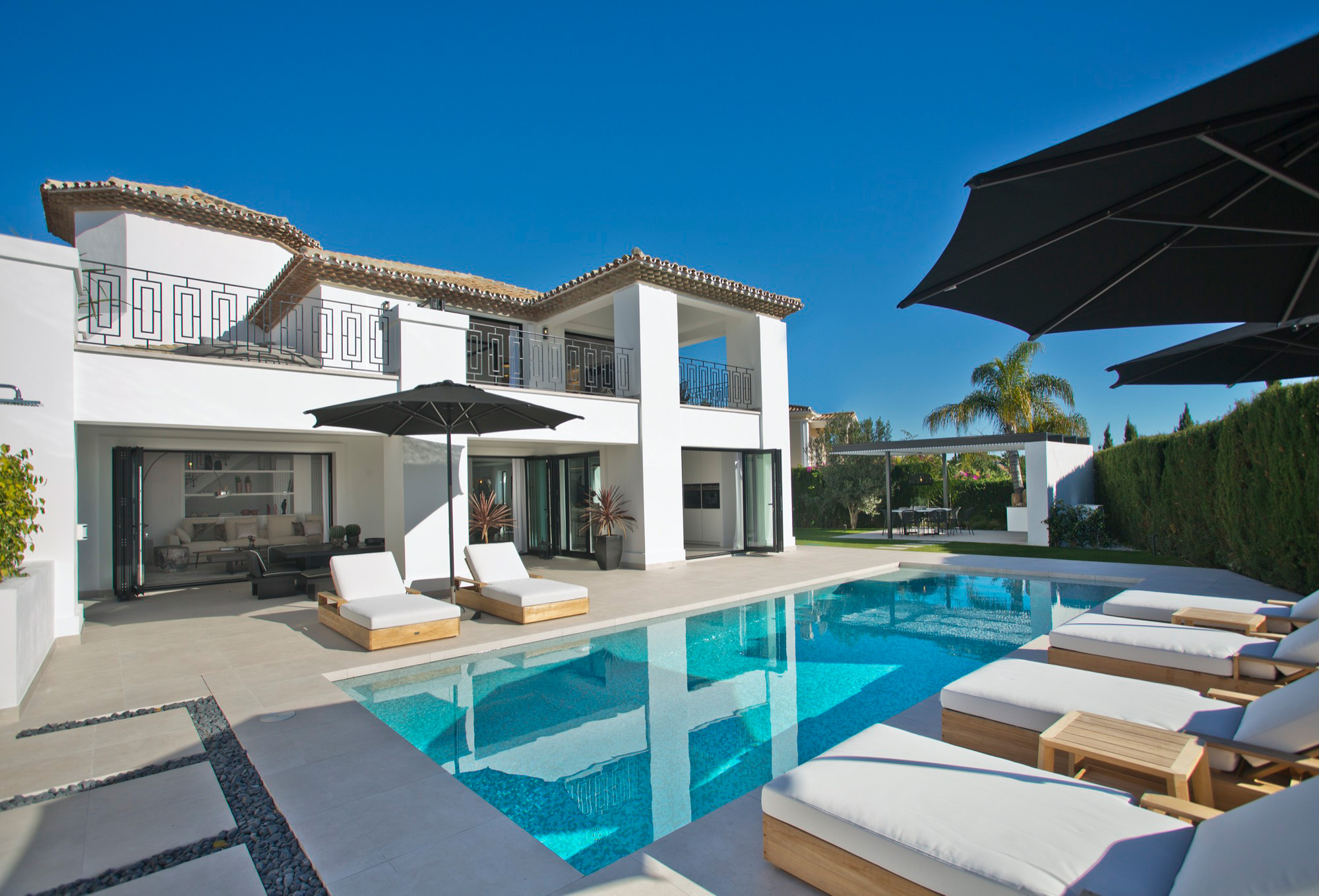 Modern elegant home combining classic exterior architecture with contemporary interiors and offering panoramic views towards the golf course and sea.