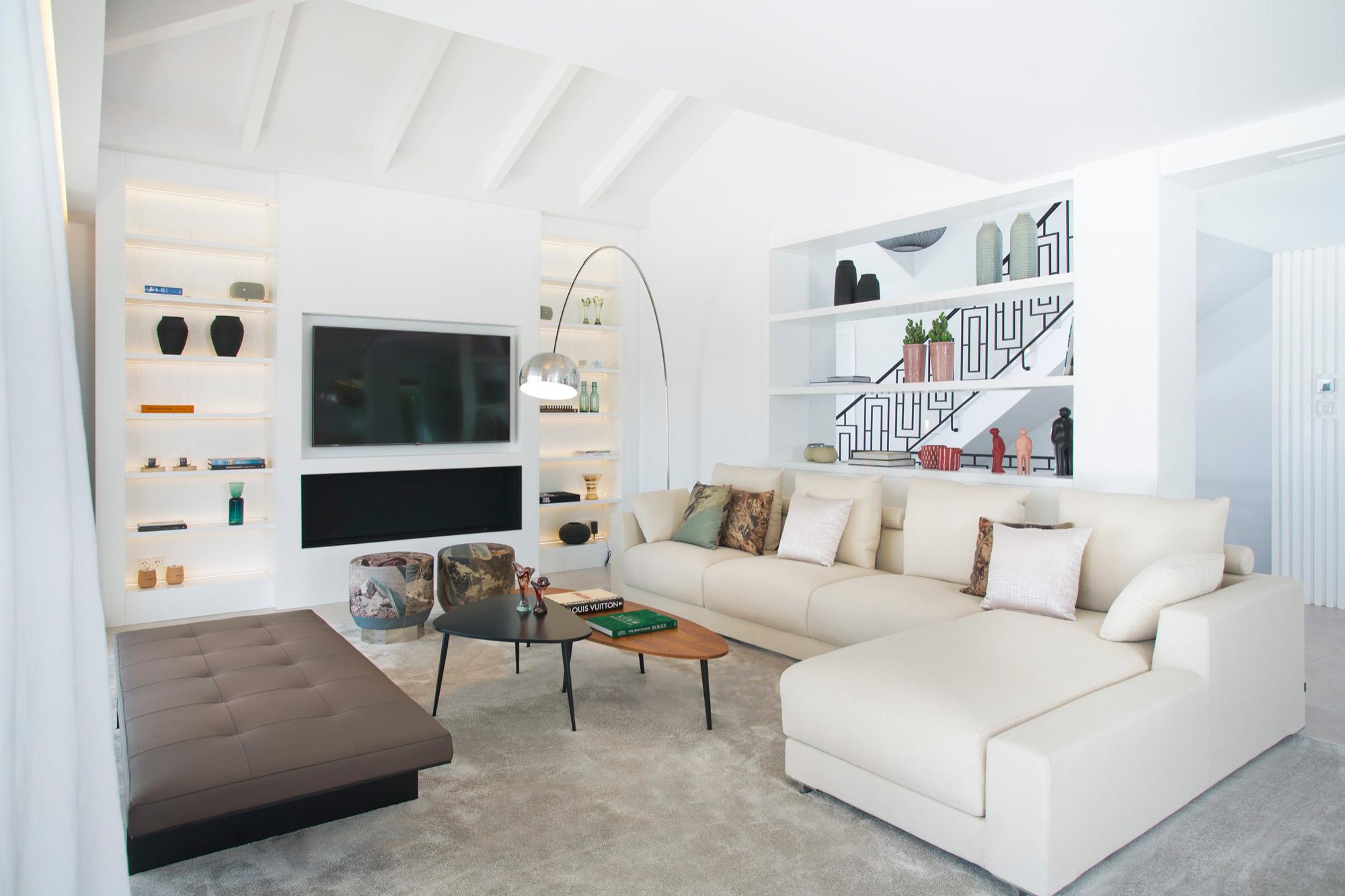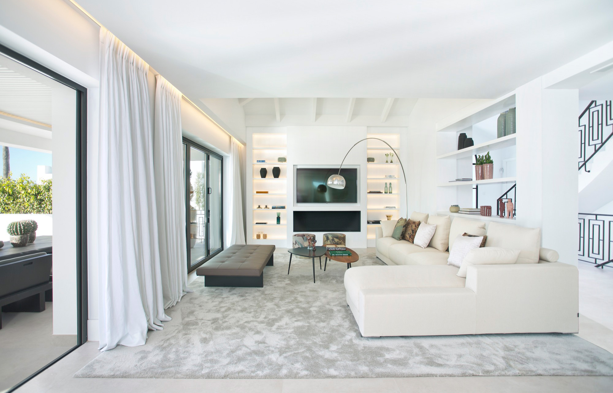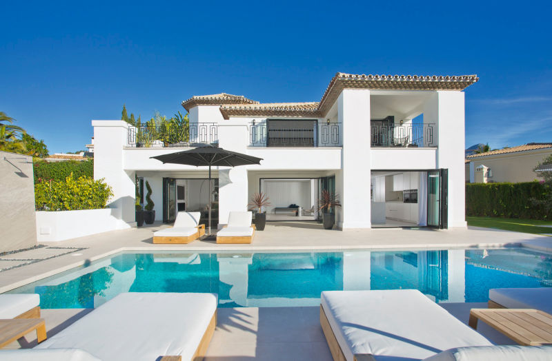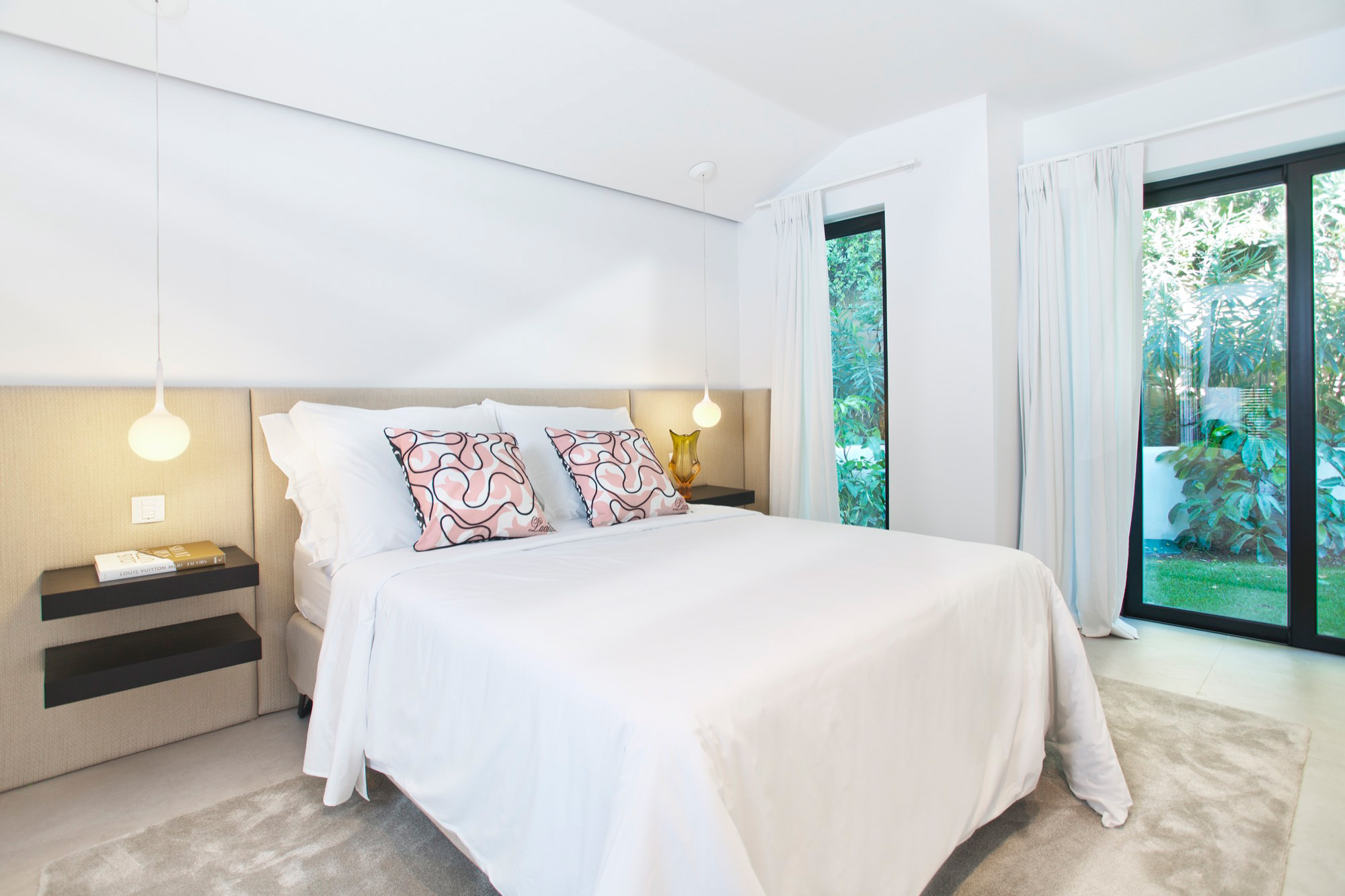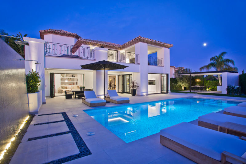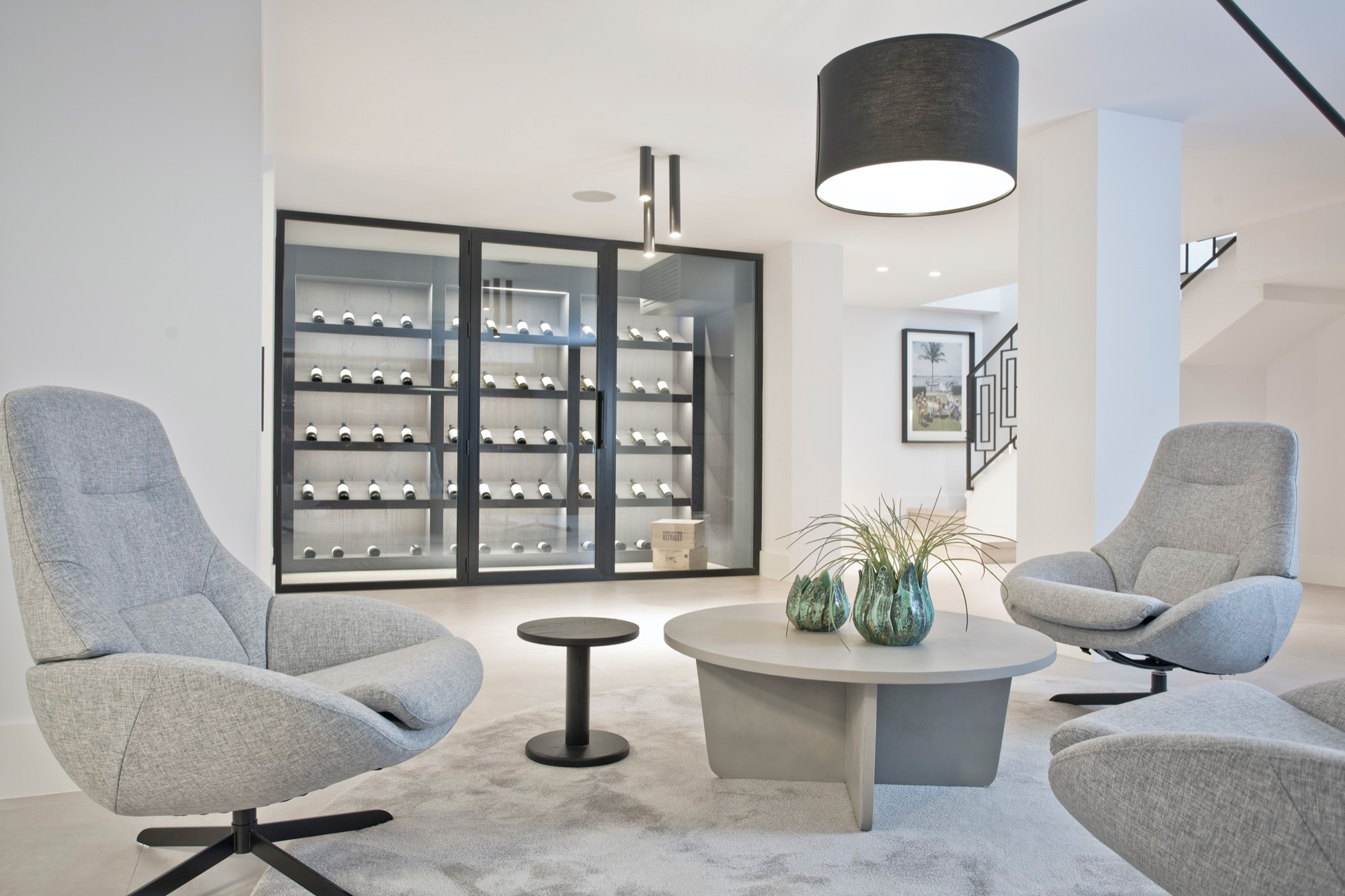 Modern elegant home combining classic exterior architecture with contemporary interiors and offering panoramic views towards the golf course and sea.