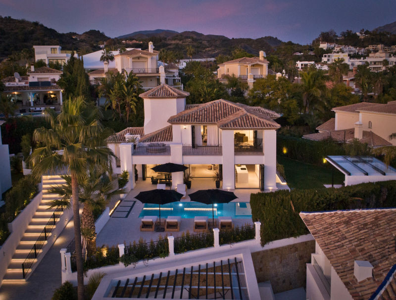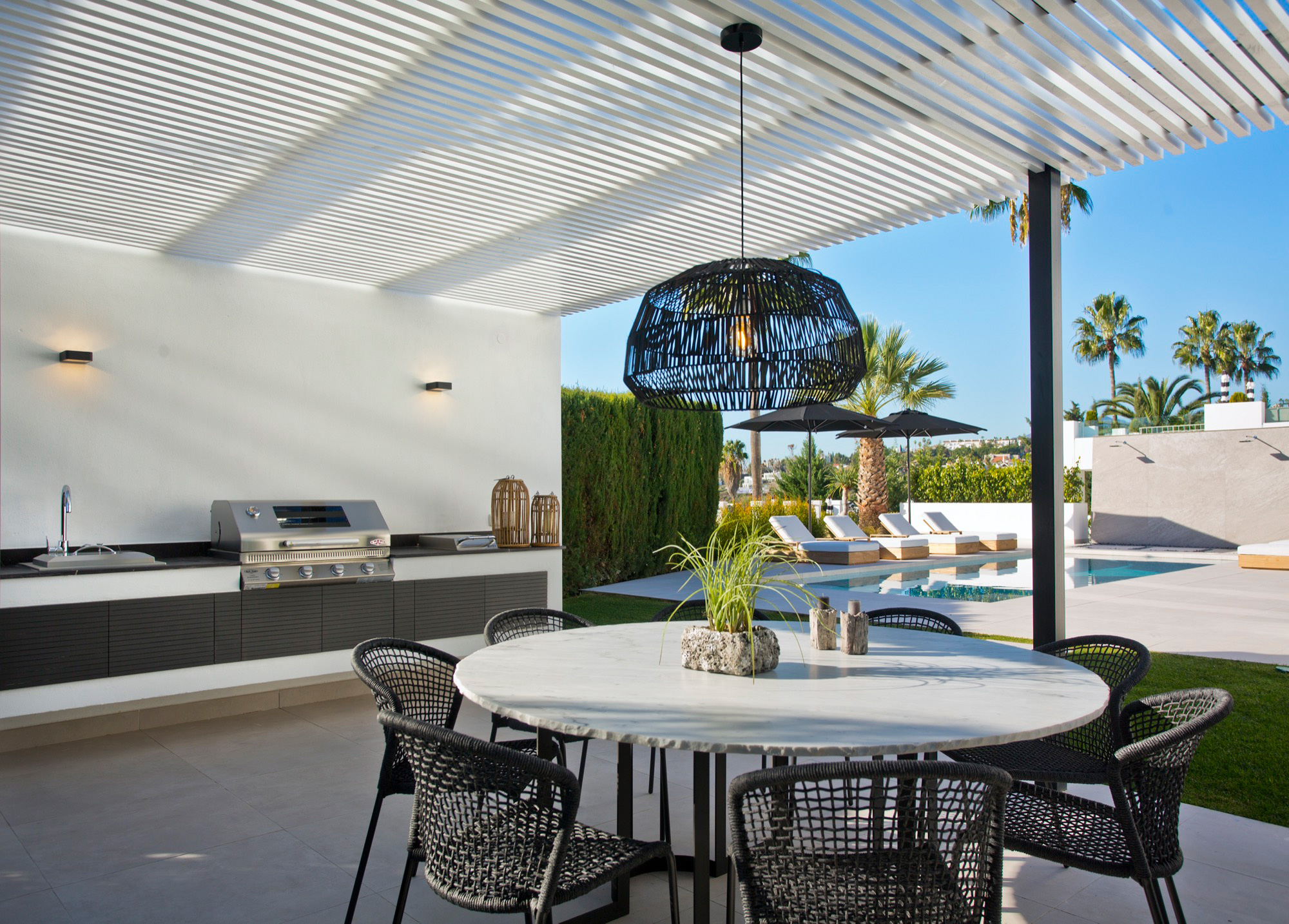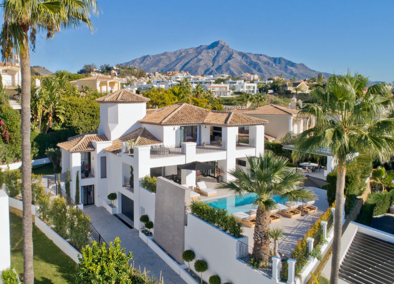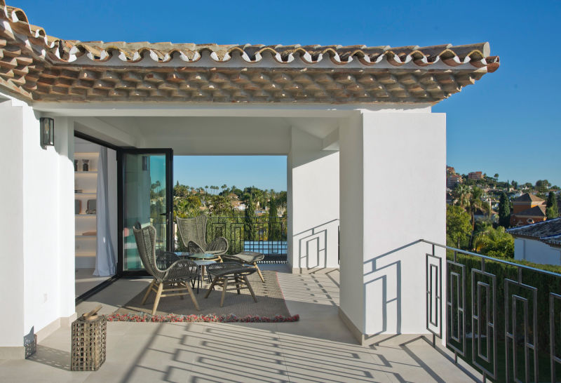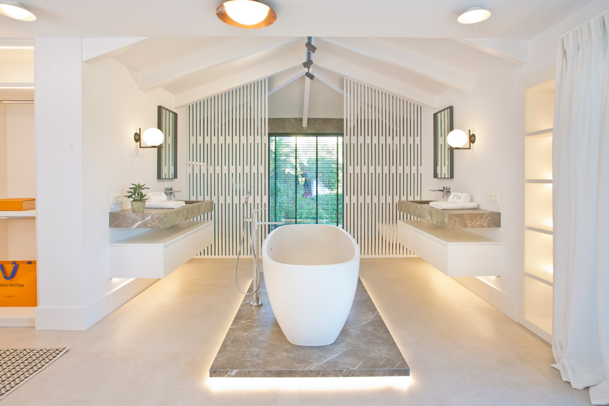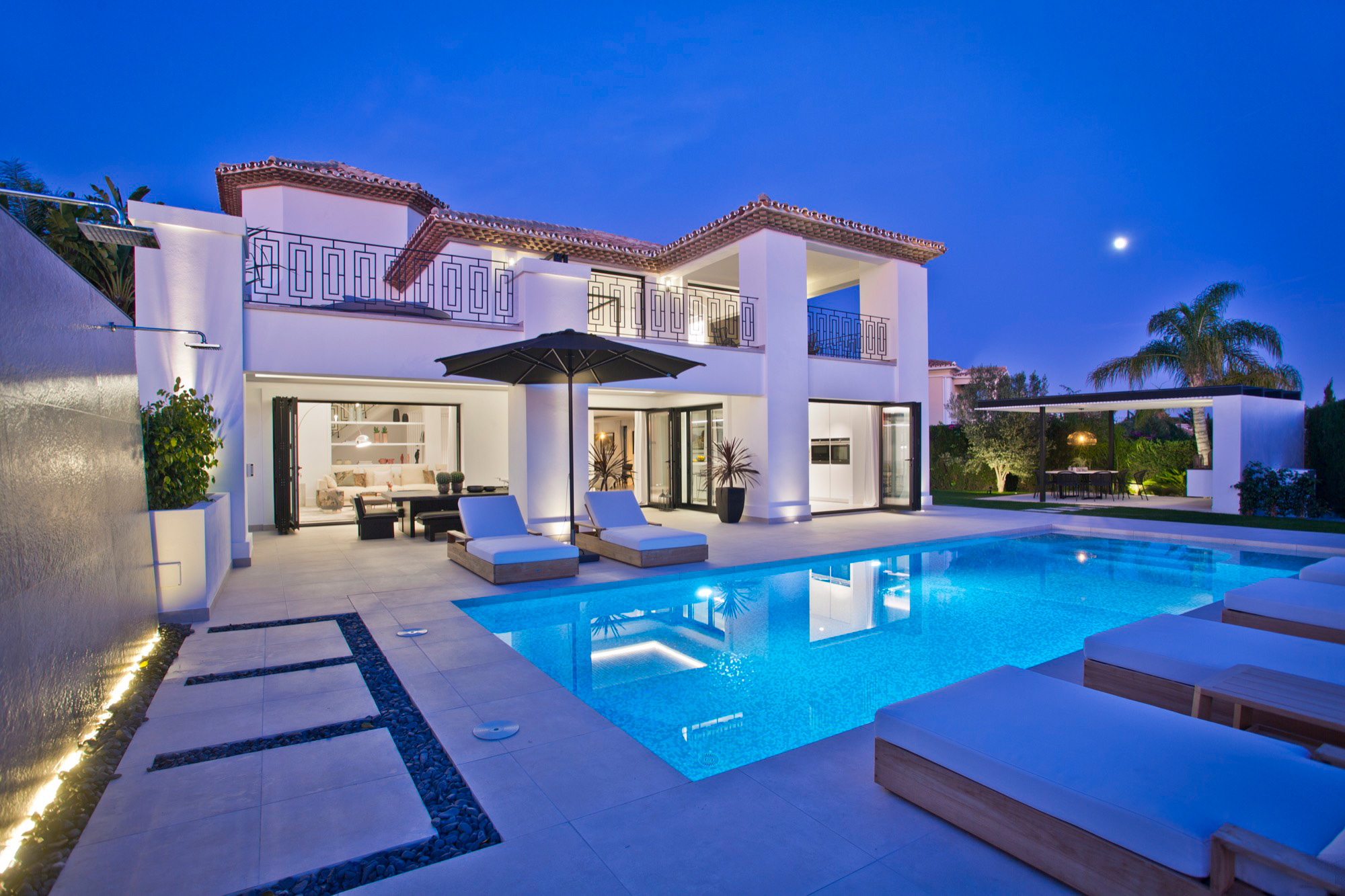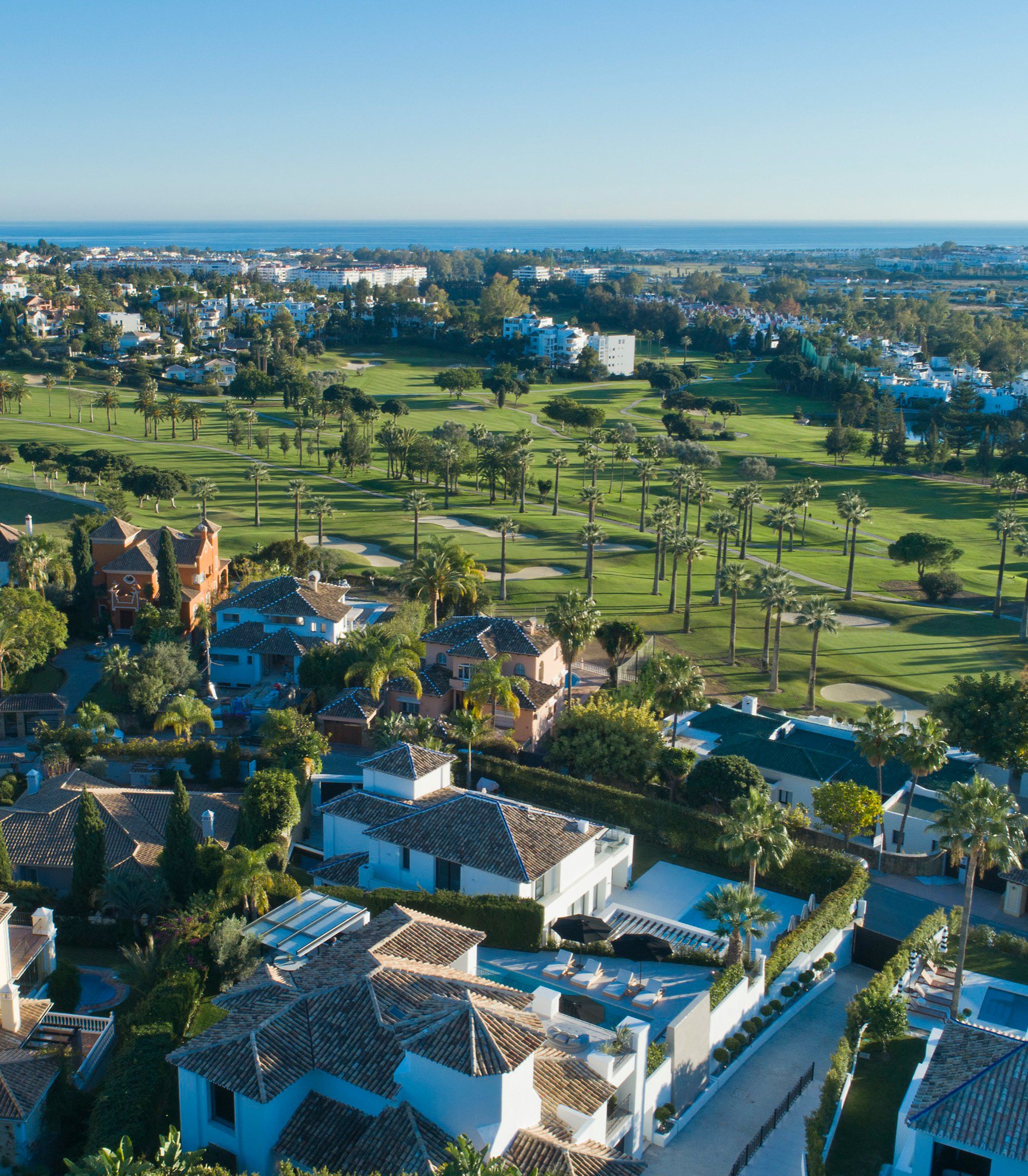 Modern elegant home combining classic exterior architecture with contemporary interiors and offering panoramic views towards the golf course and sea.