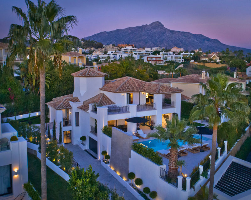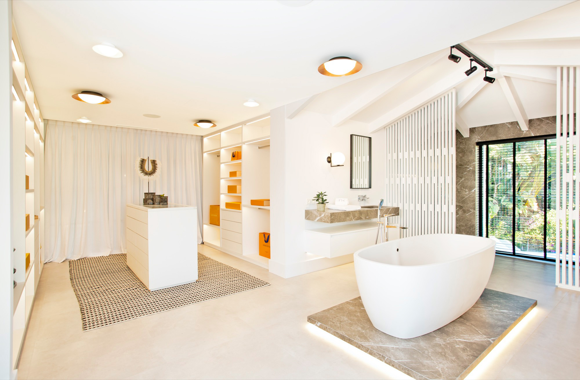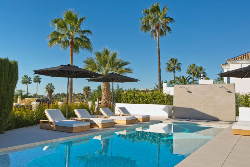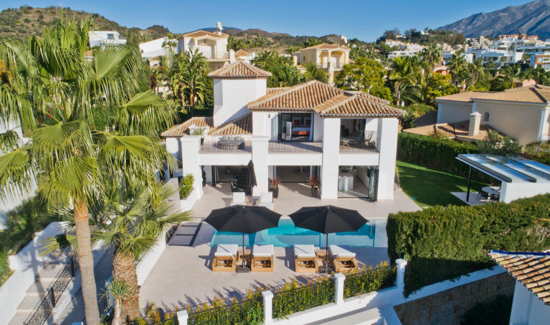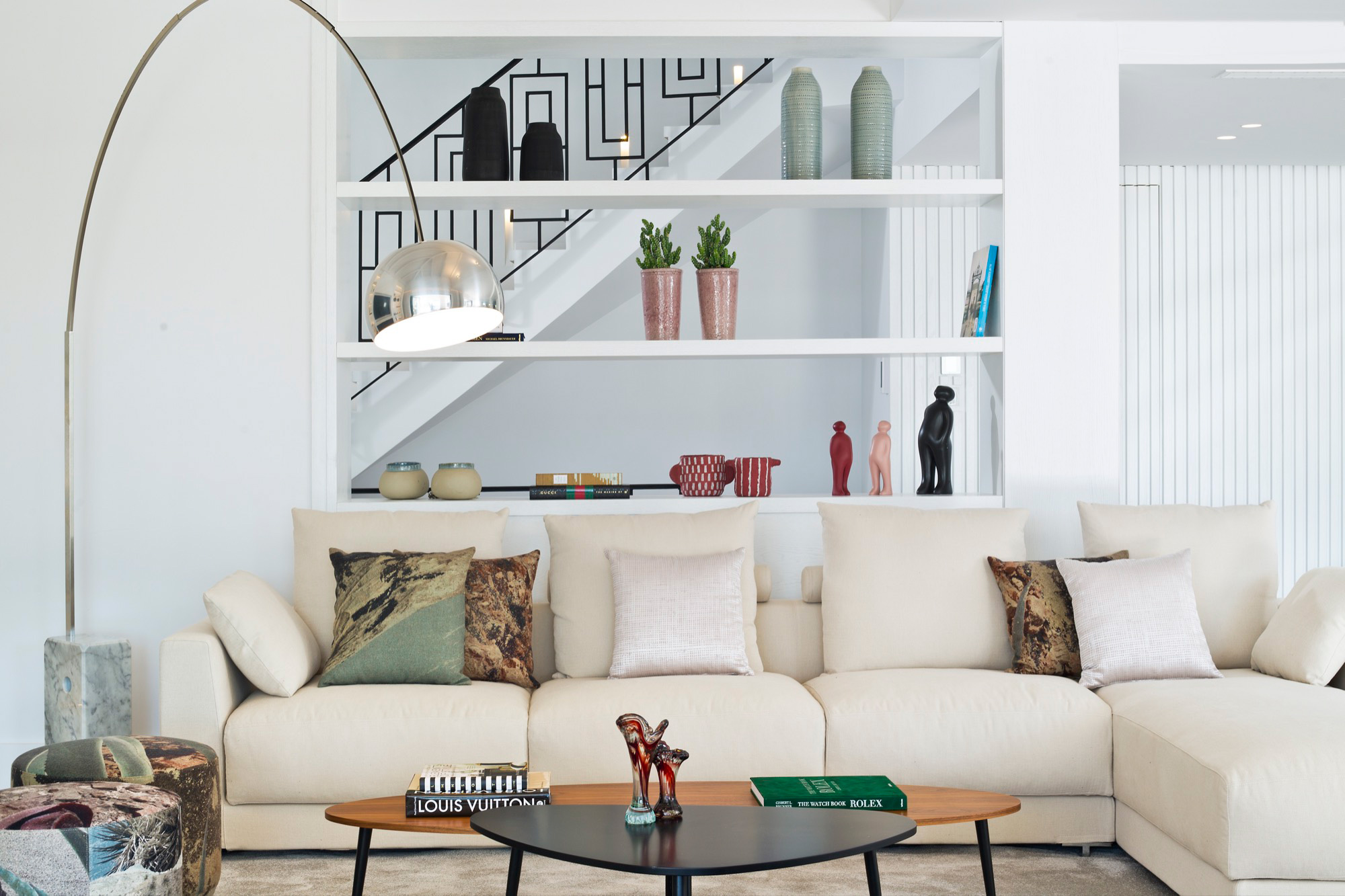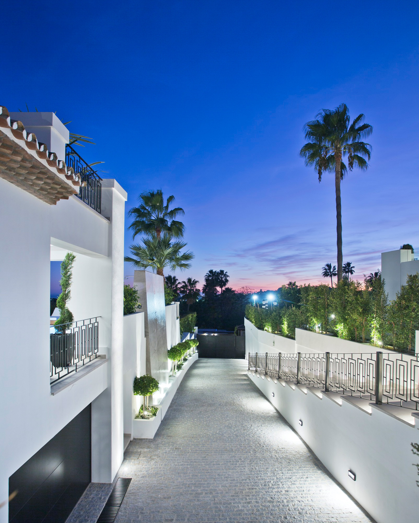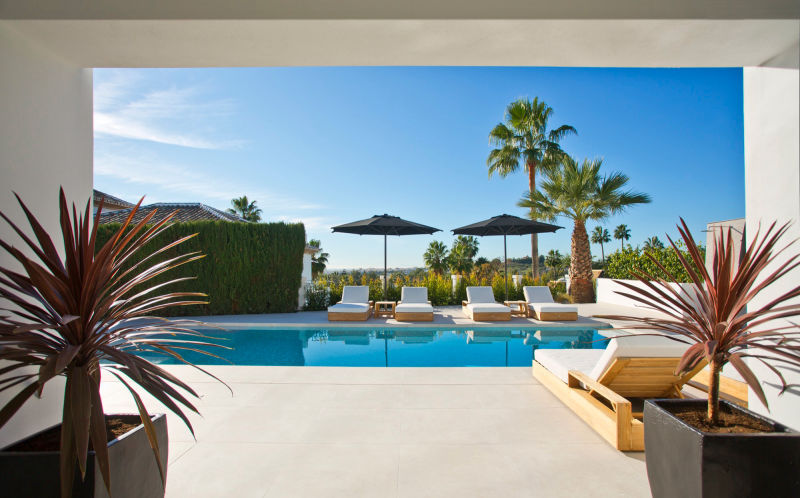 Modern elegant home combining classic exterior architecture with contemporary interiors and offering panoramic views towards the golf course and sea.