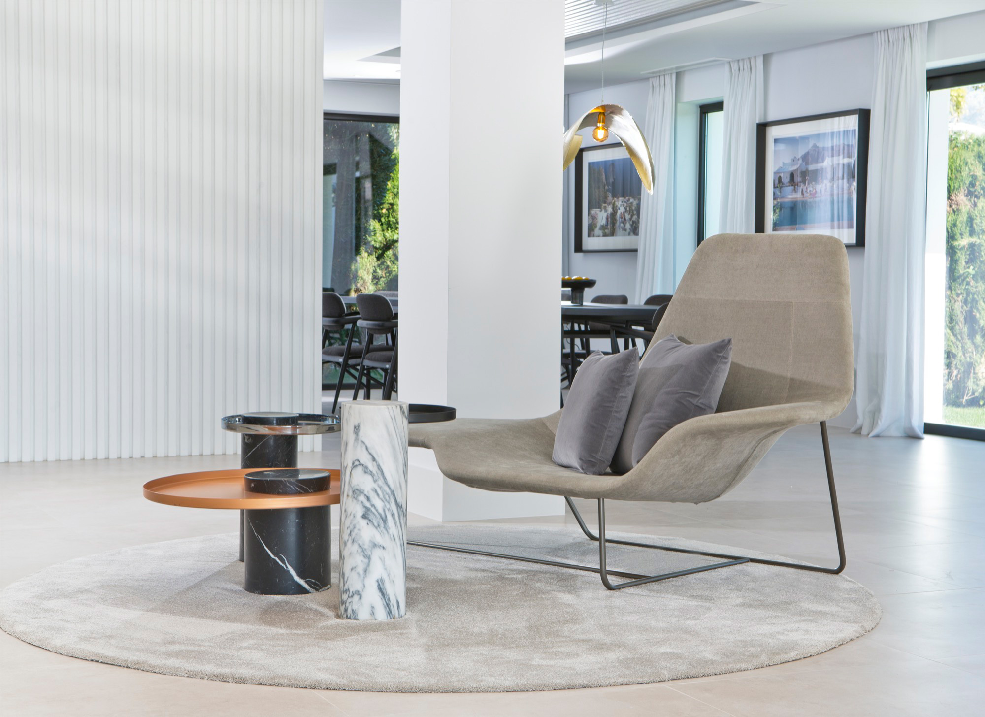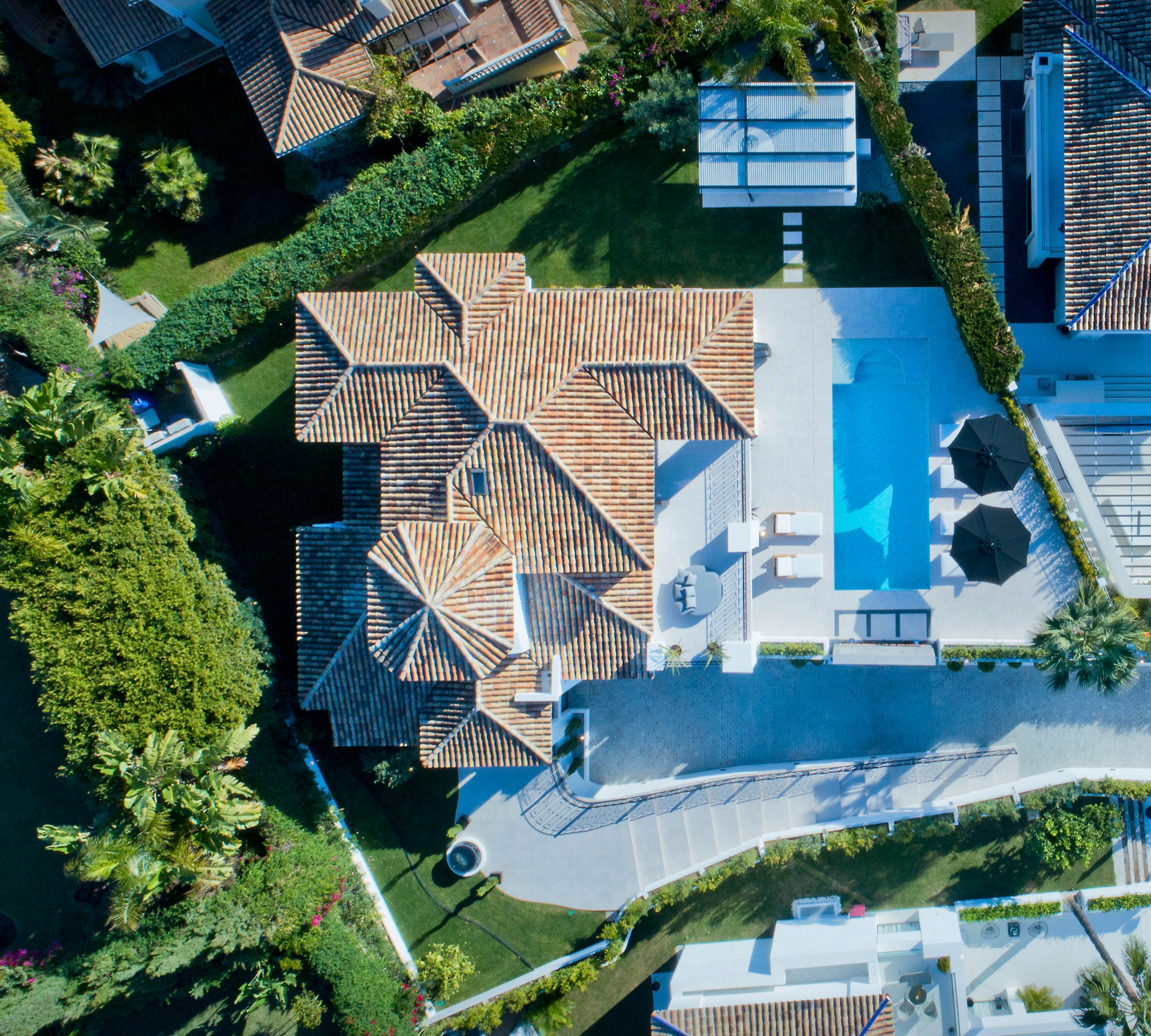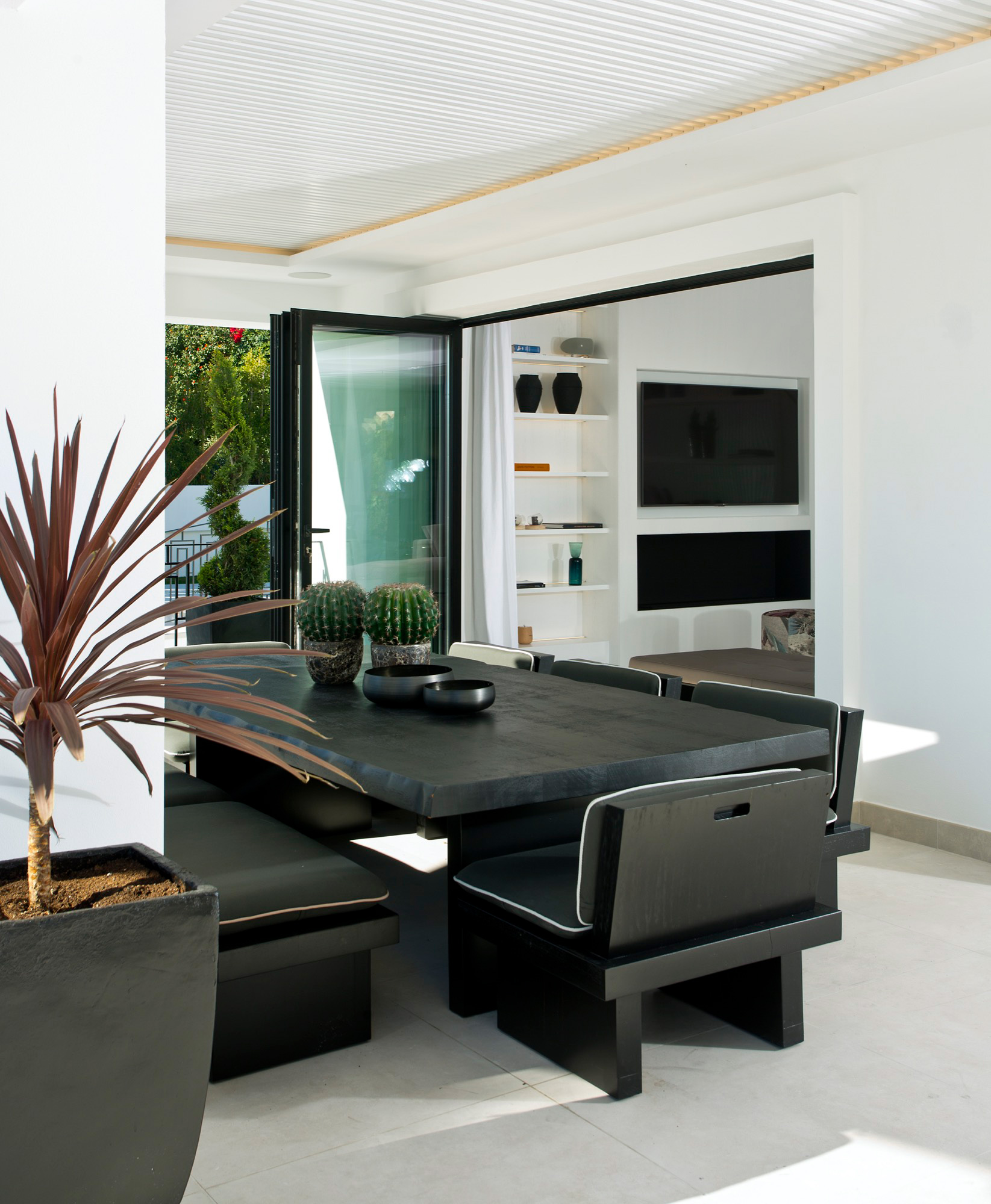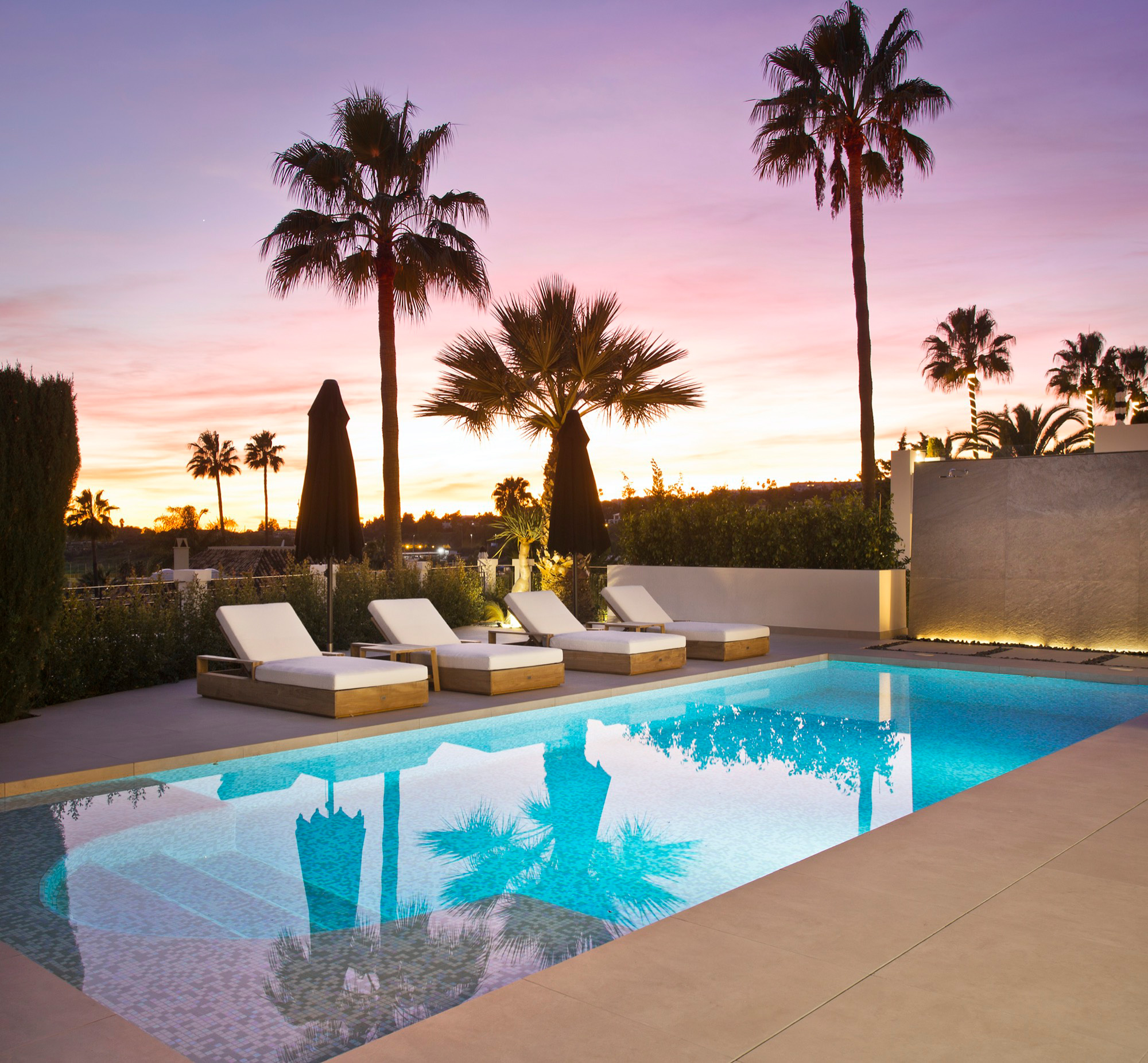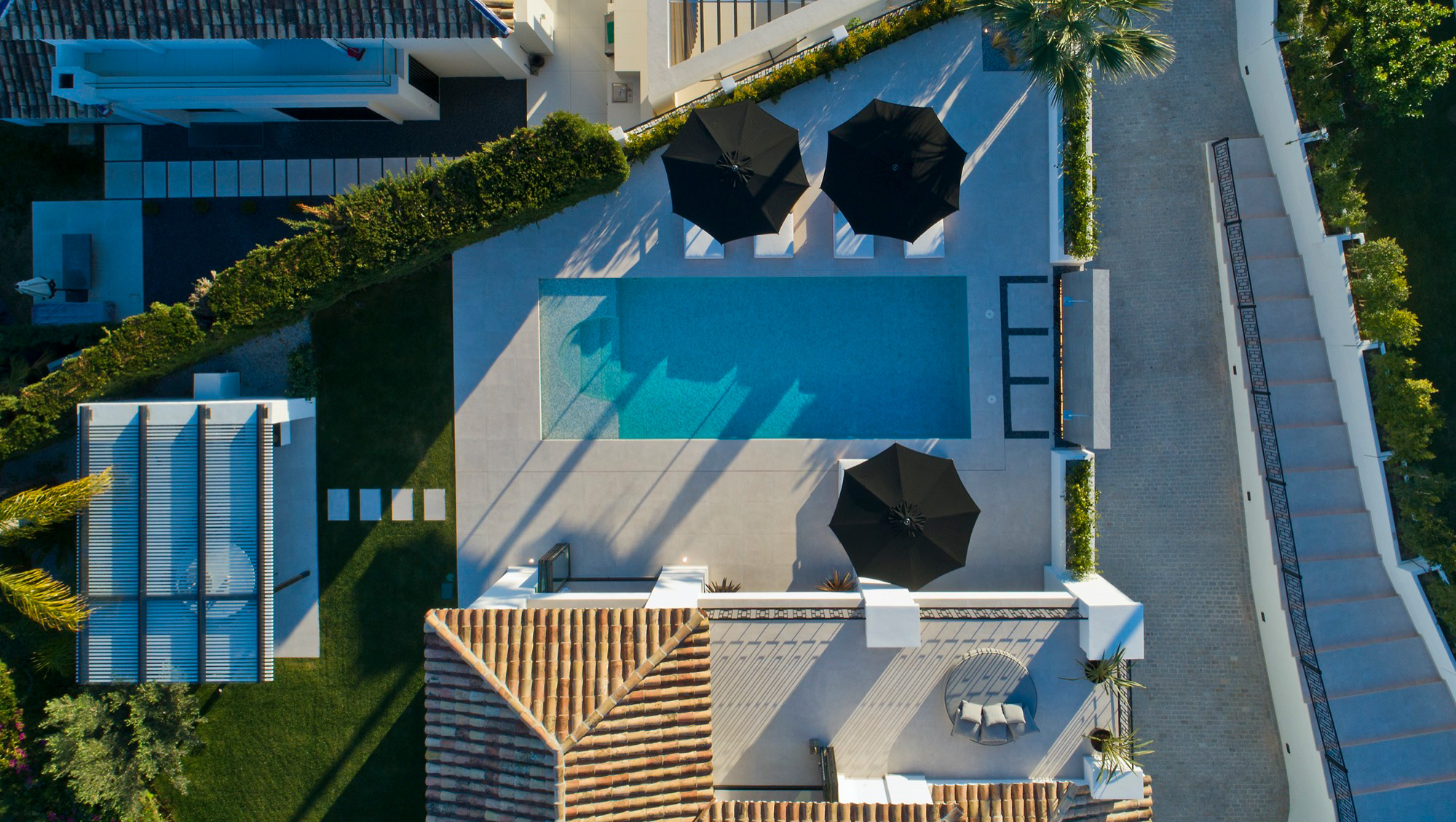 Modern elegant home combining classic exterior architecture with contemporary interiors and offering panoramic views towards the golf course and sea.